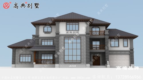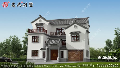 162平方米 新 中式 农村三层别墅 设计图 和 效果图 , 14 X 13 米, 灰褐色 组合 ,灰 坡屋顶 , 本体 墙面 在 白色 中 加入 灰...