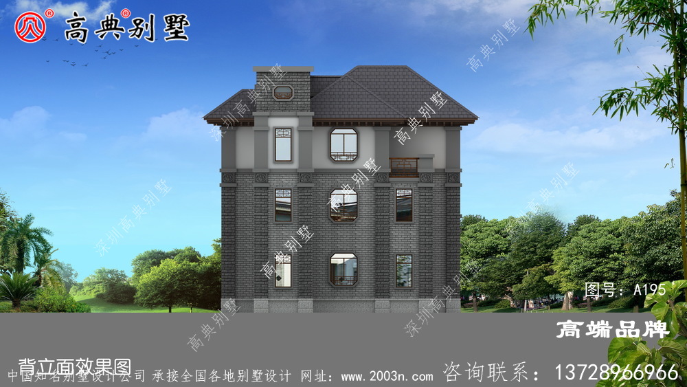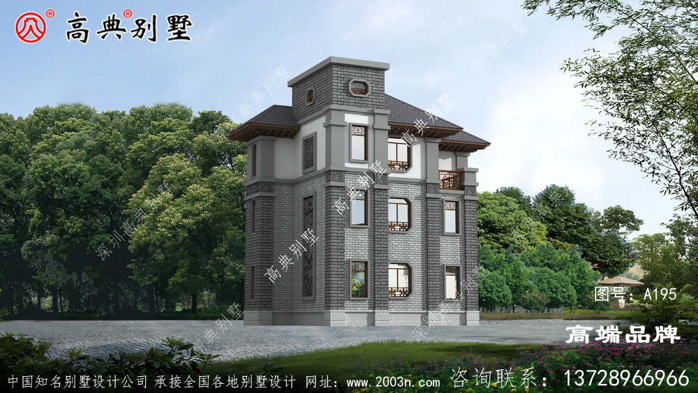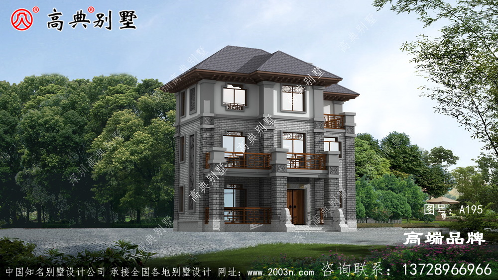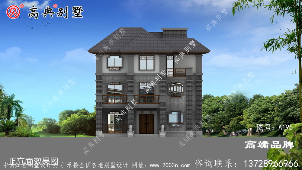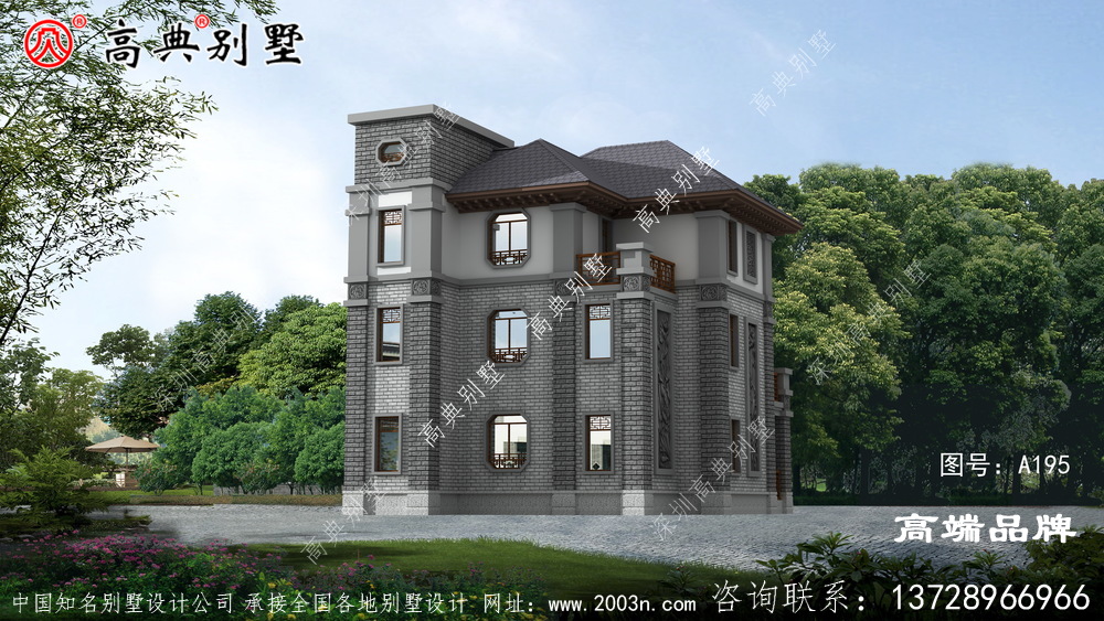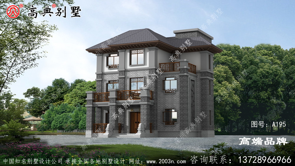 A195号别墅外墙主要材料:水泥平板瓦、真石漆、面砖、麻石