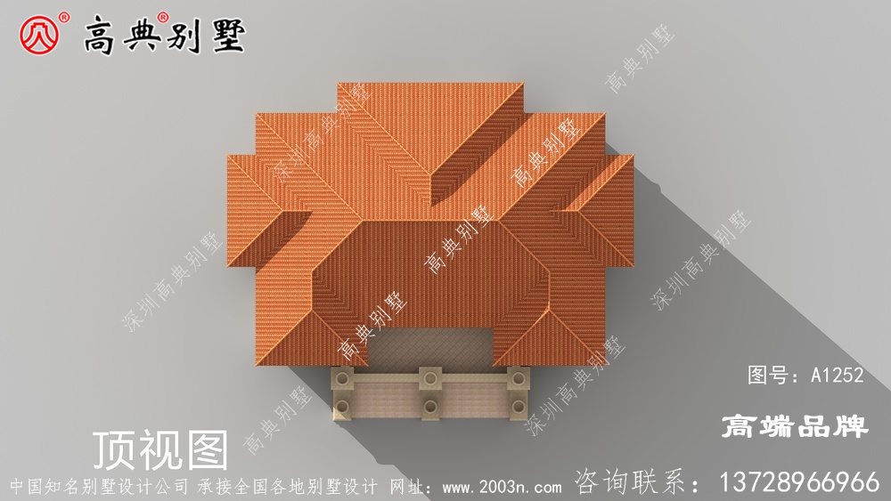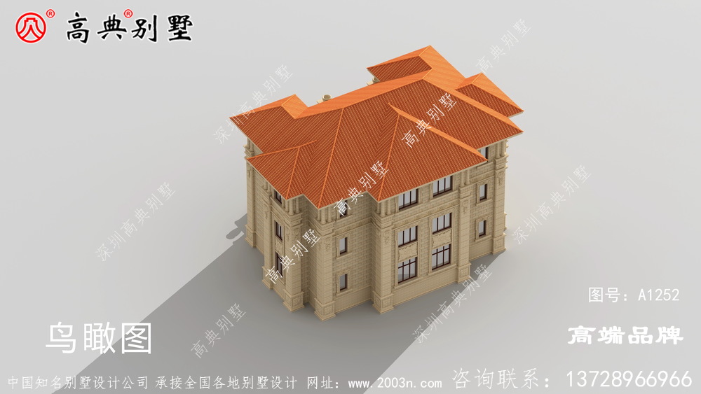 A1252号别墅外墙材料:外墙仿石材真石漆、310X310 S瓦、GRC水泥构件