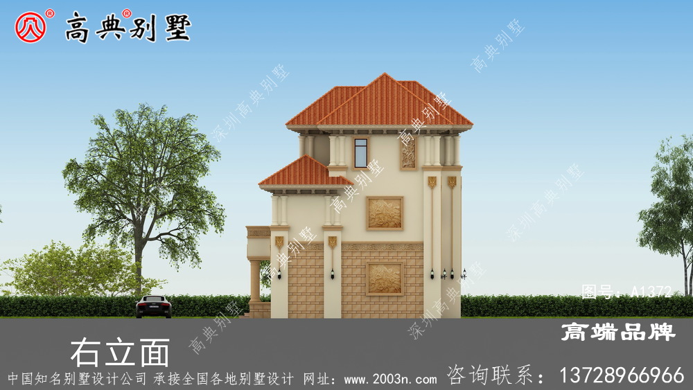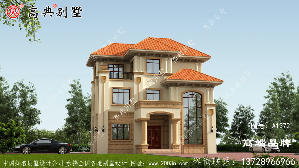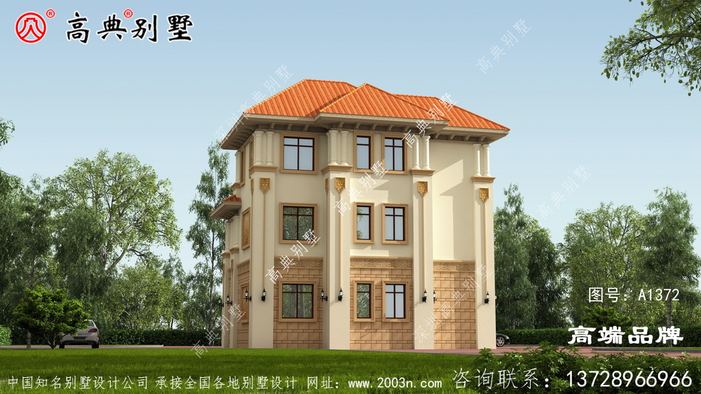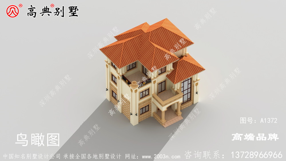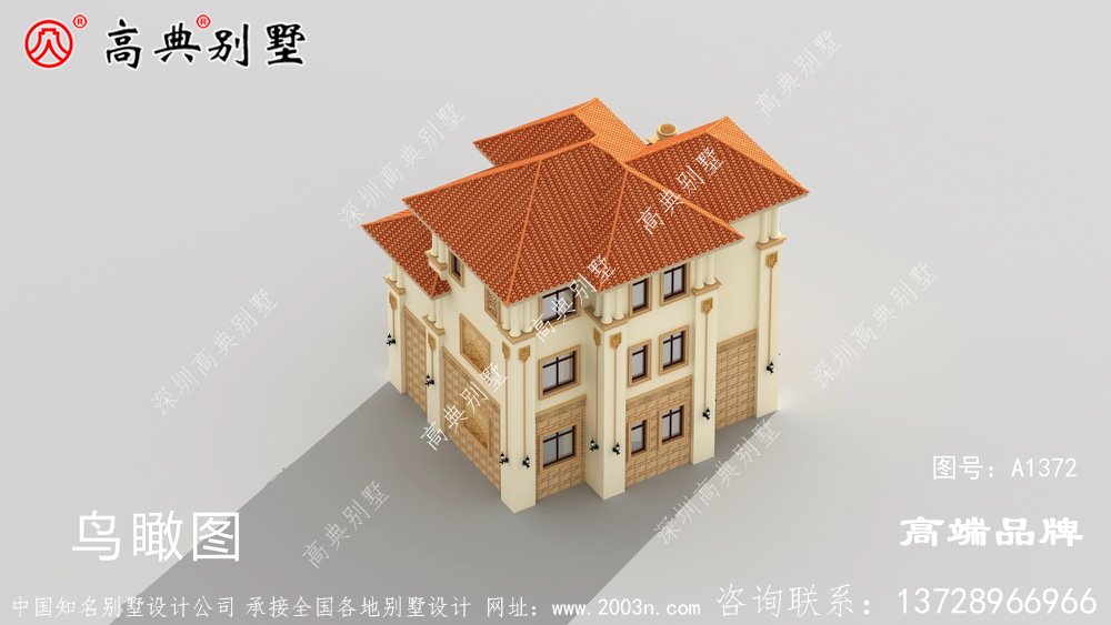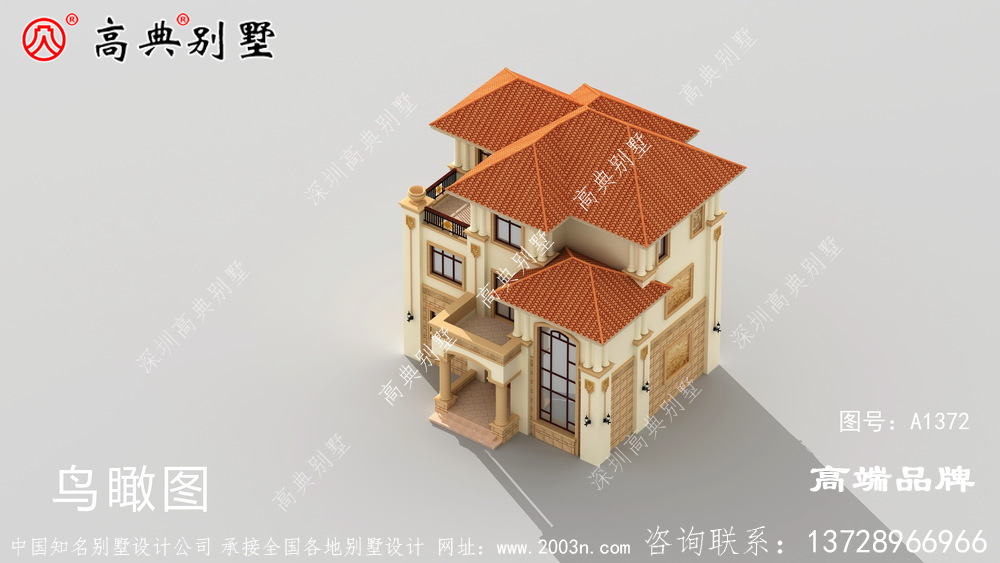 A1372号别墅外墙主要材料:砂岩石、真石漆、天然砂岩石浮雕、310X310 S瓦、GRC水泥构件、铁艺栏杆
