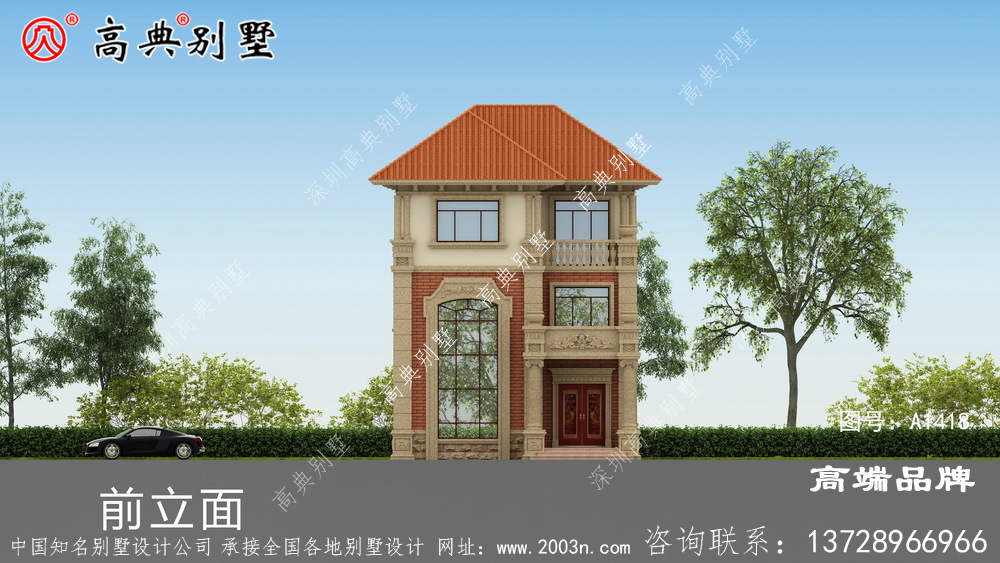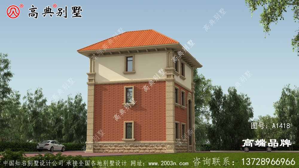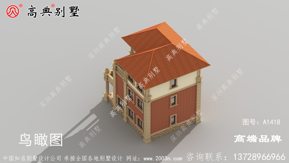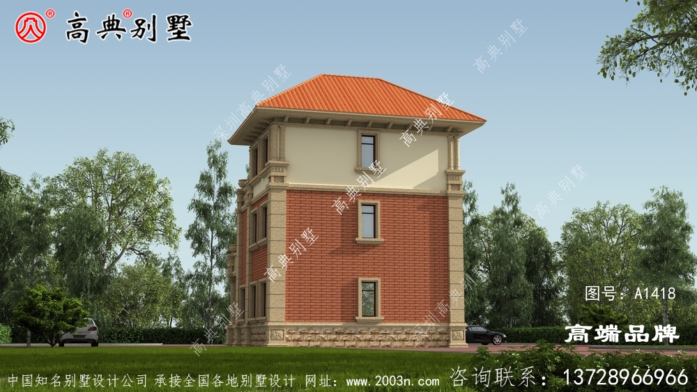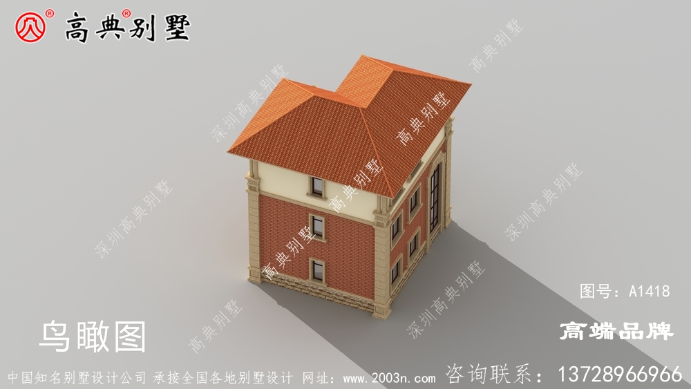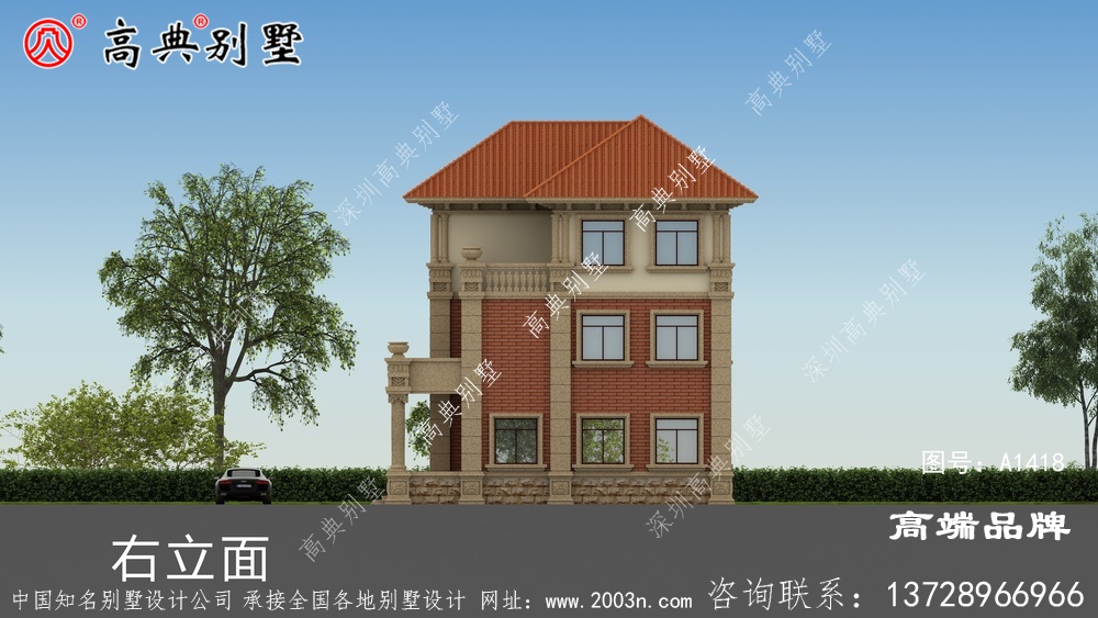 A1418号别墅外墙主要材料:黄锈石、劈开砖、真石漆、310X310S瓦、葫芦柱栏杆
