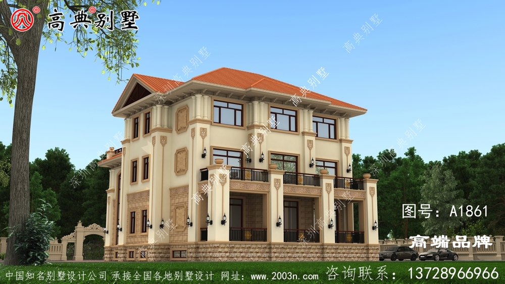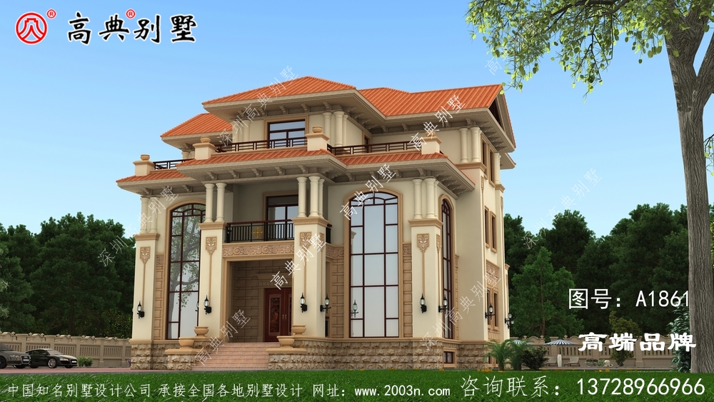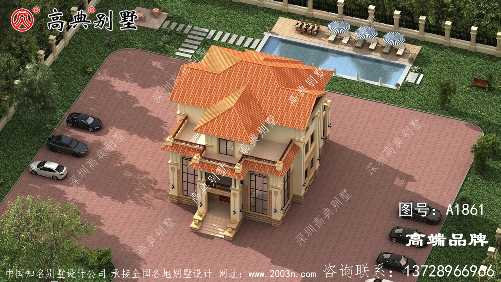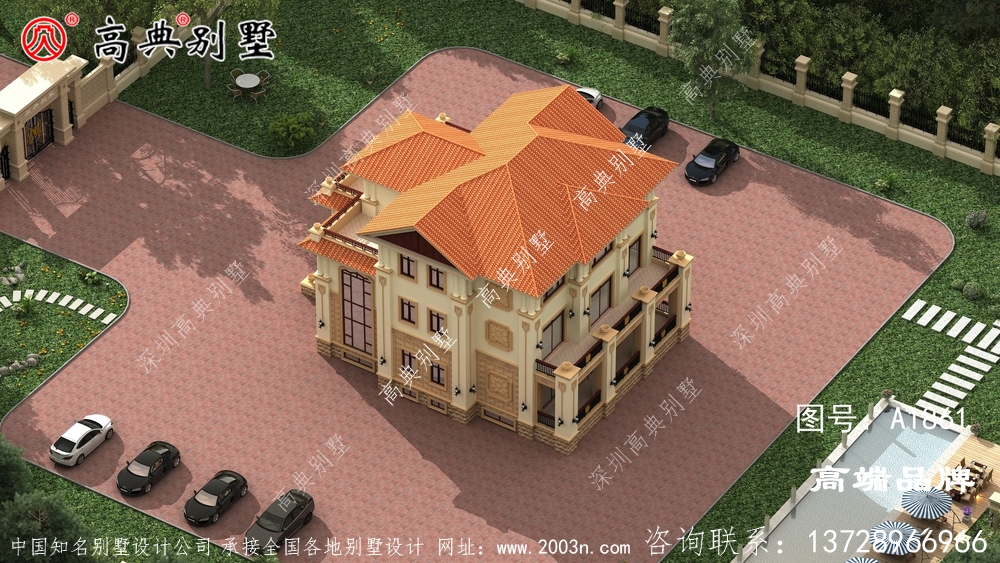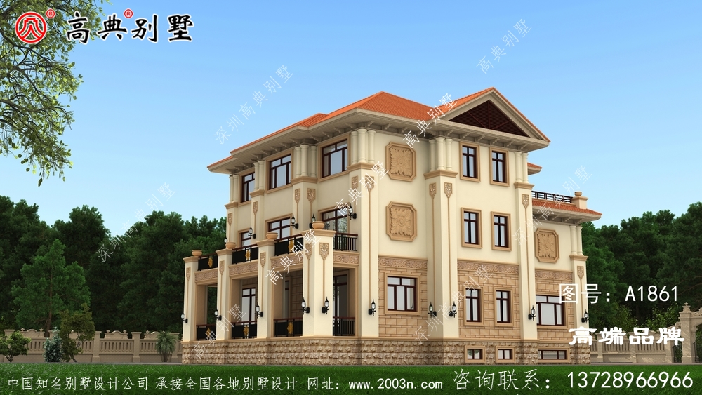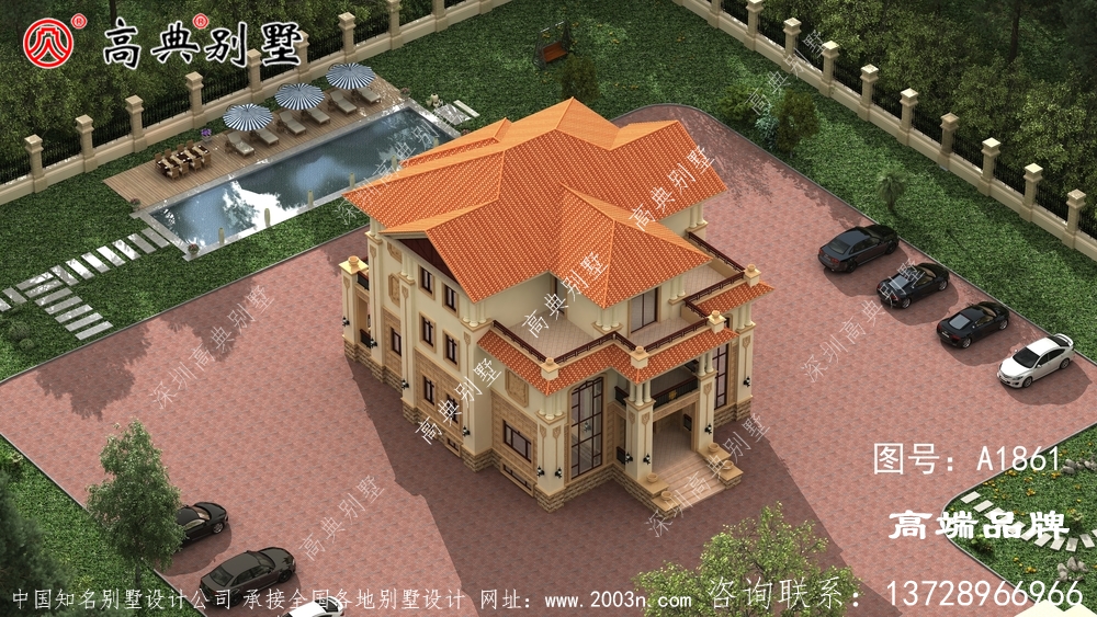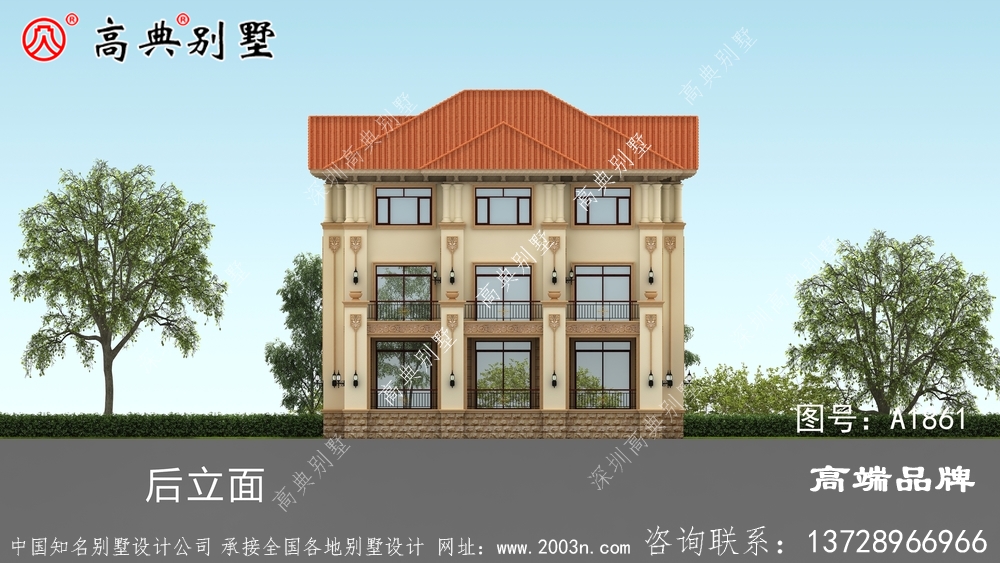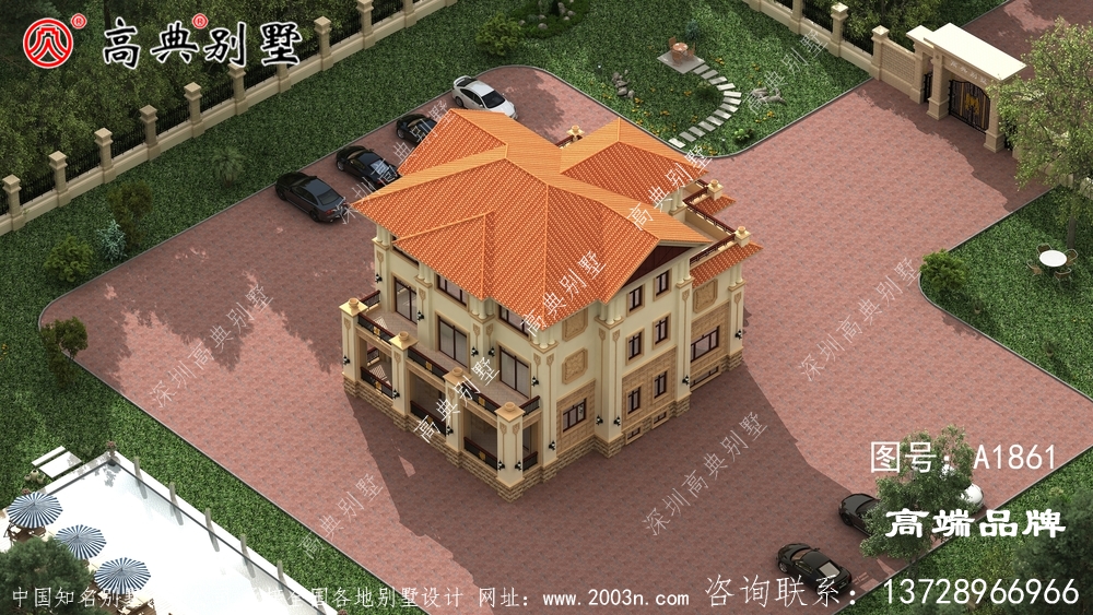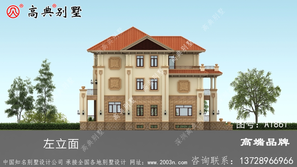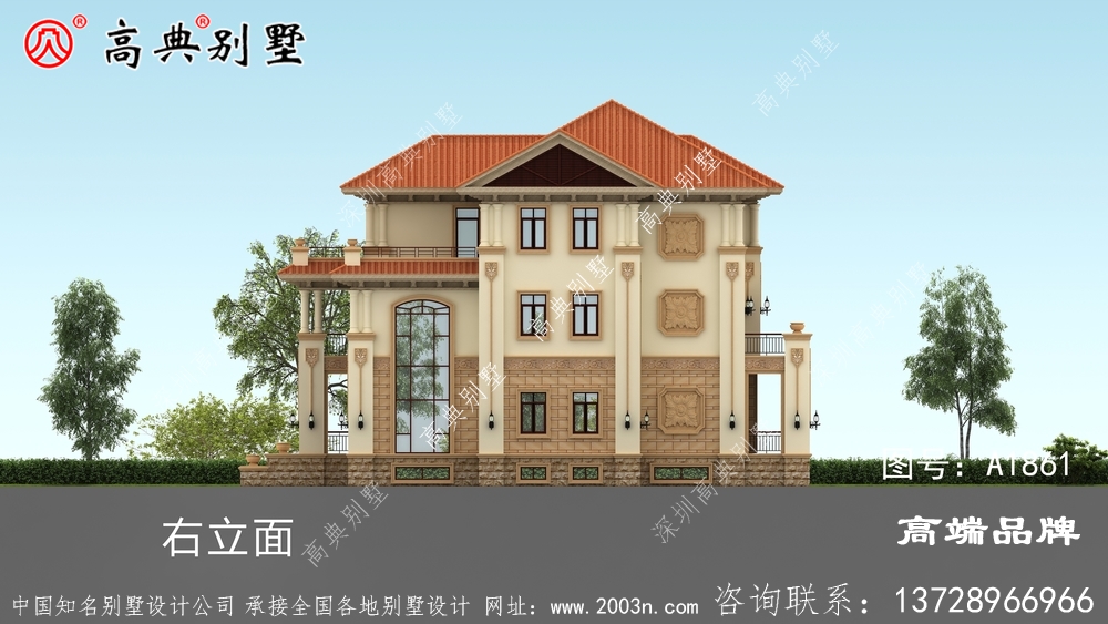 A1861号别墅外墙主要材料:砂岩石、真石漆、310X310S瓦