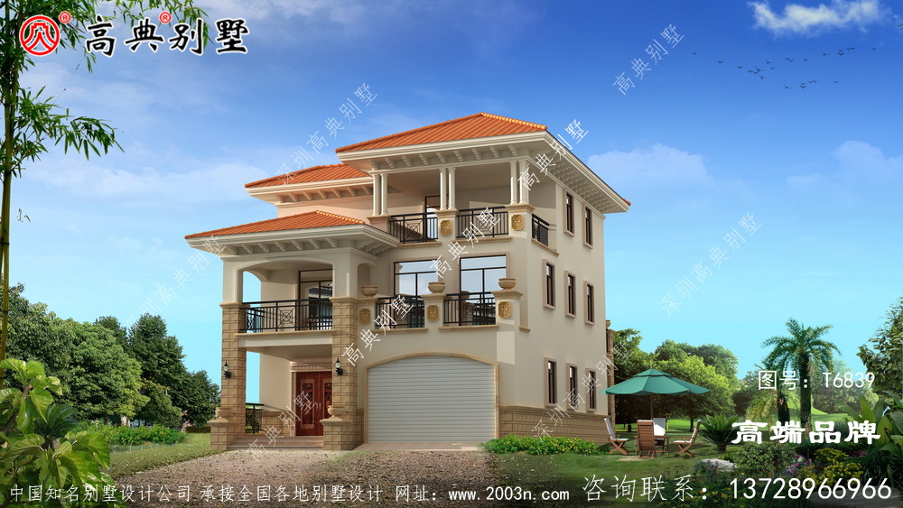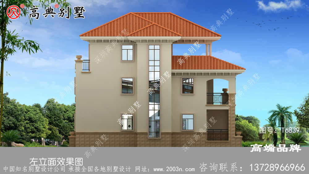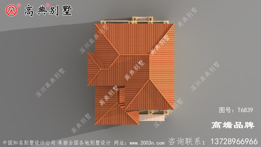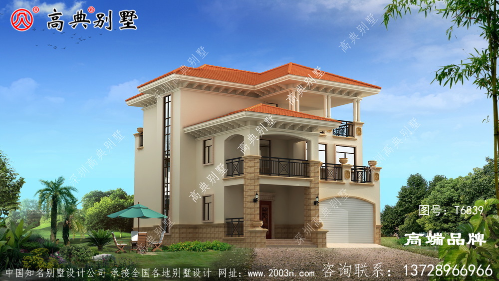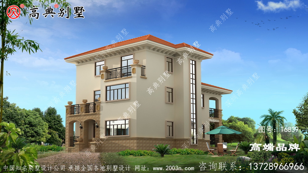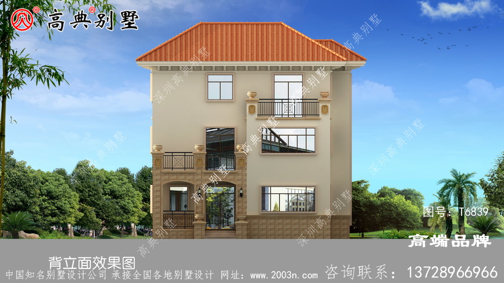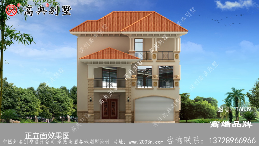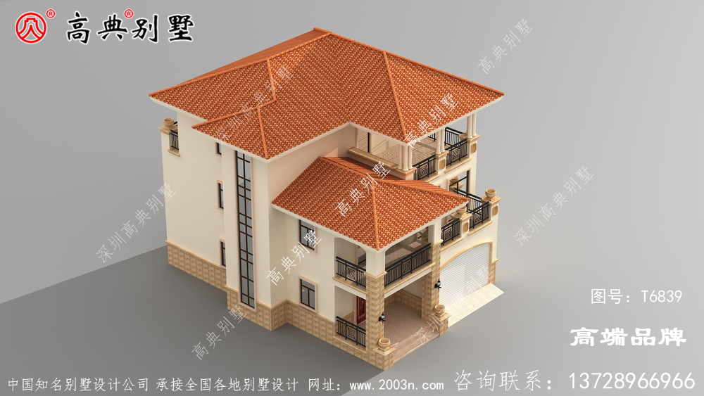 t6839号别墅外墙主要材料:天然岩石漆、天然砂岩石板材、天然砂岩石浮雕、310X310 S瓦、GRC水泥构件、铁艺栏杆