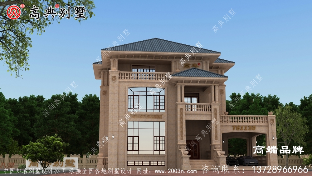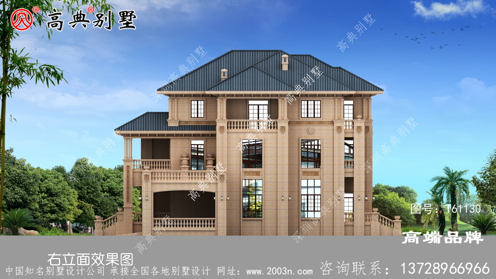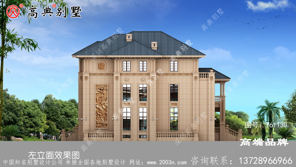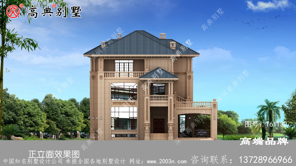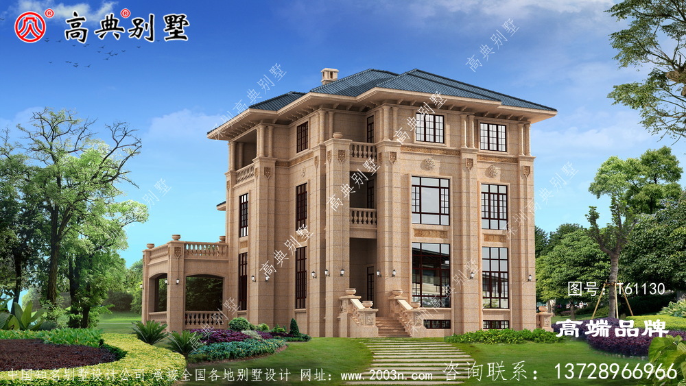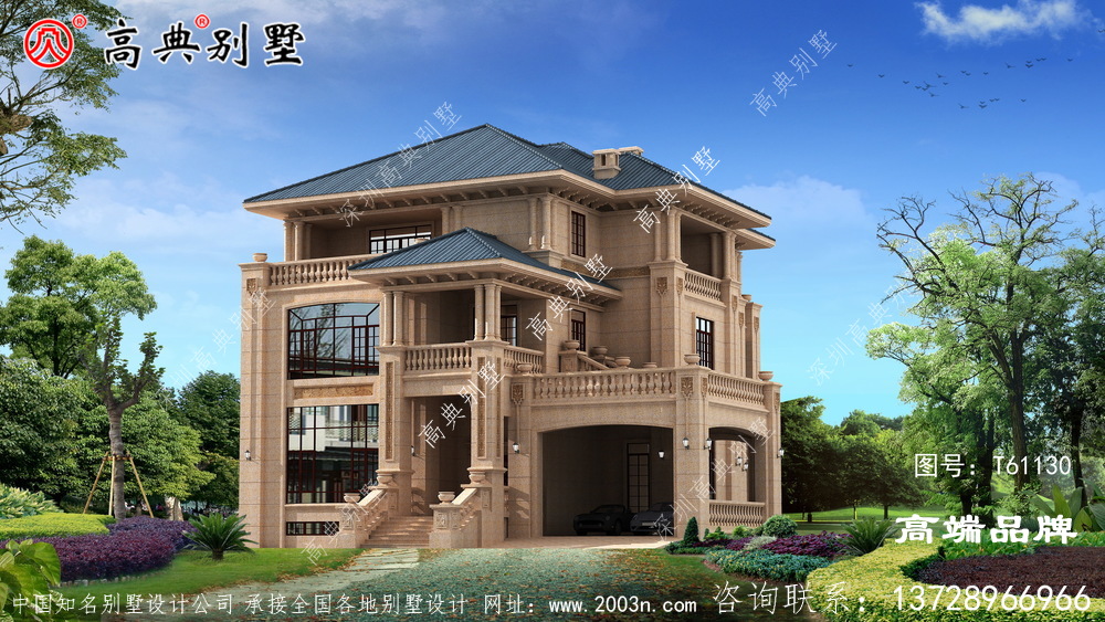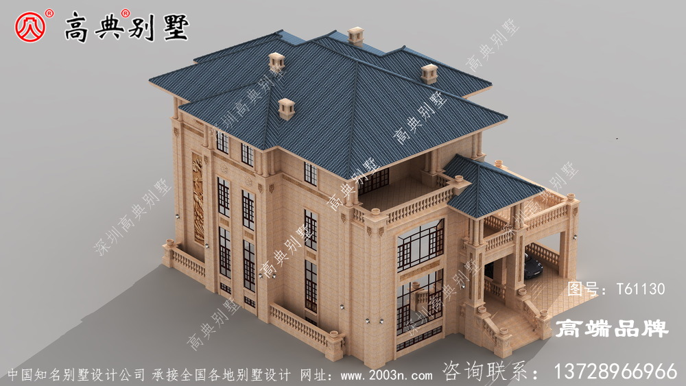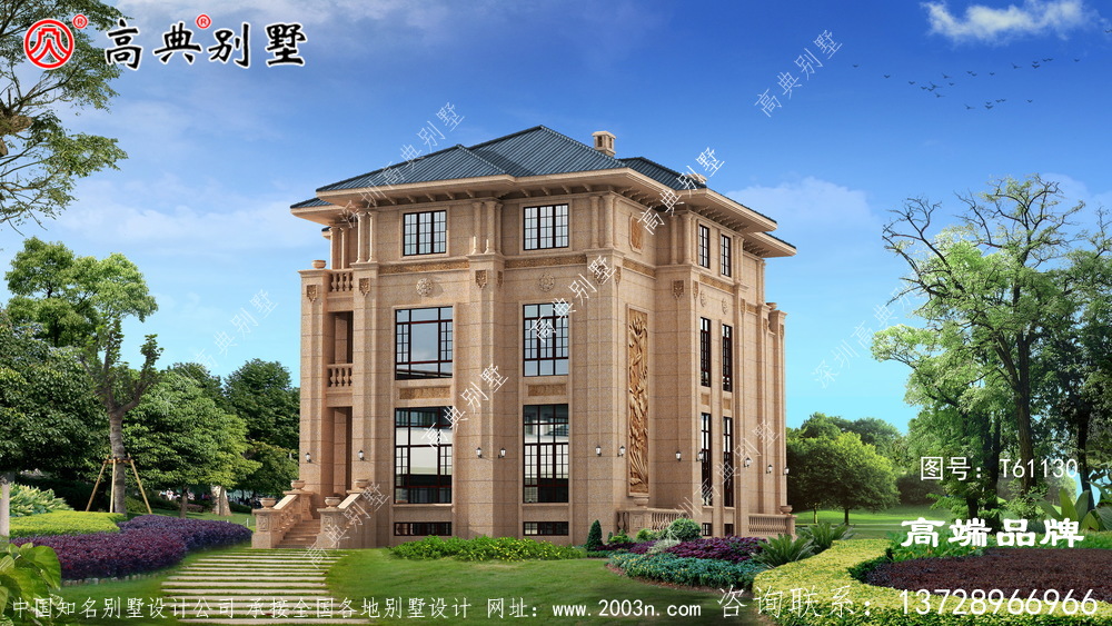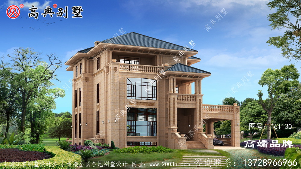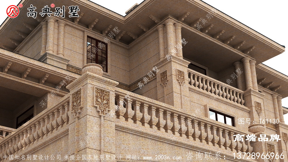 t61130号别墅外墙全部采用沙漠棕石材干挂及天然砂岩石浮雕图案、外墙纯石材别墅、屋面用310X310 S瓦