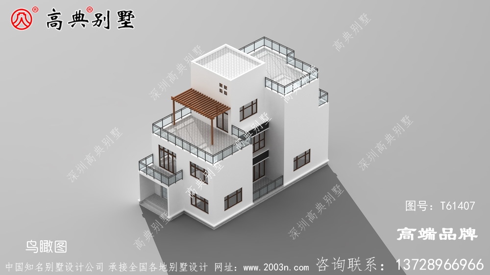 t61407号别墅外墙主要材料:天然岩石漆、不锈钢玻璃栏杆、木制葡萄架