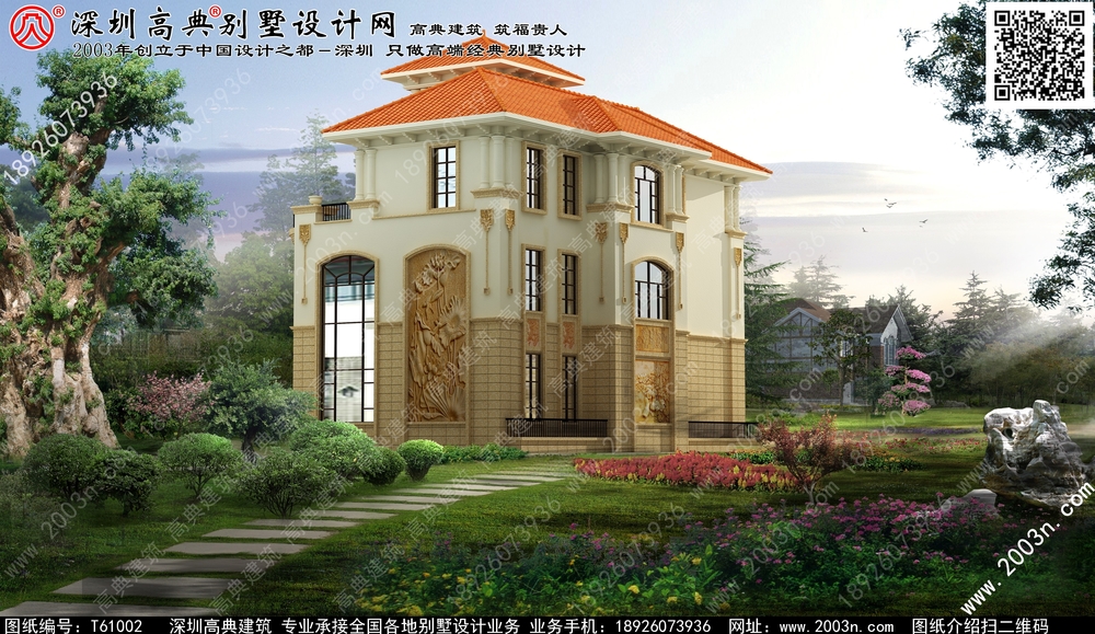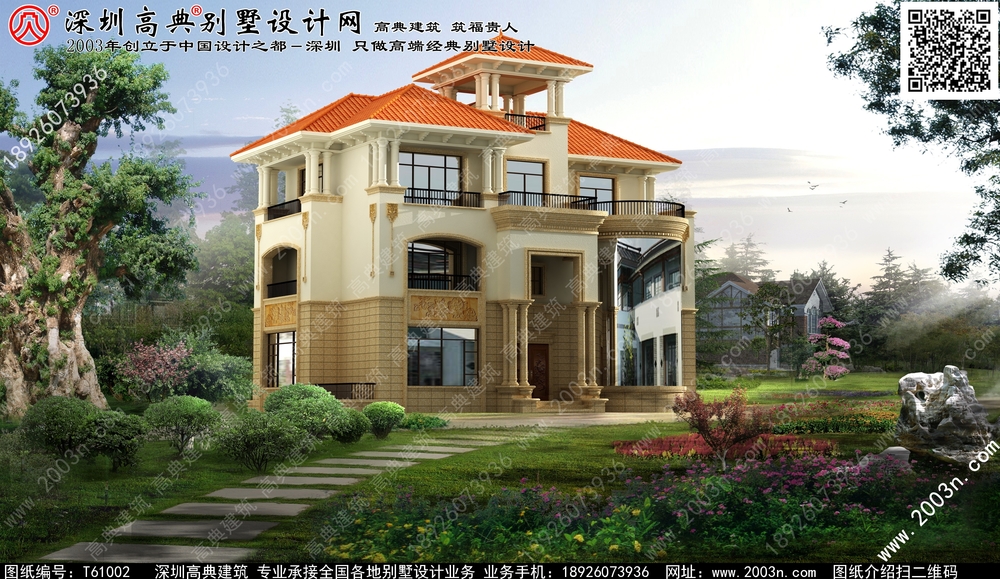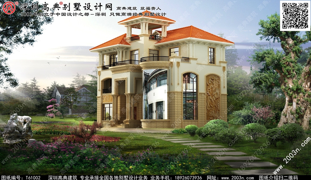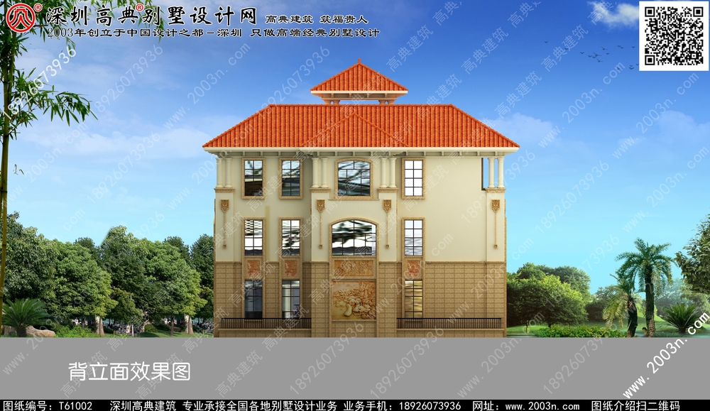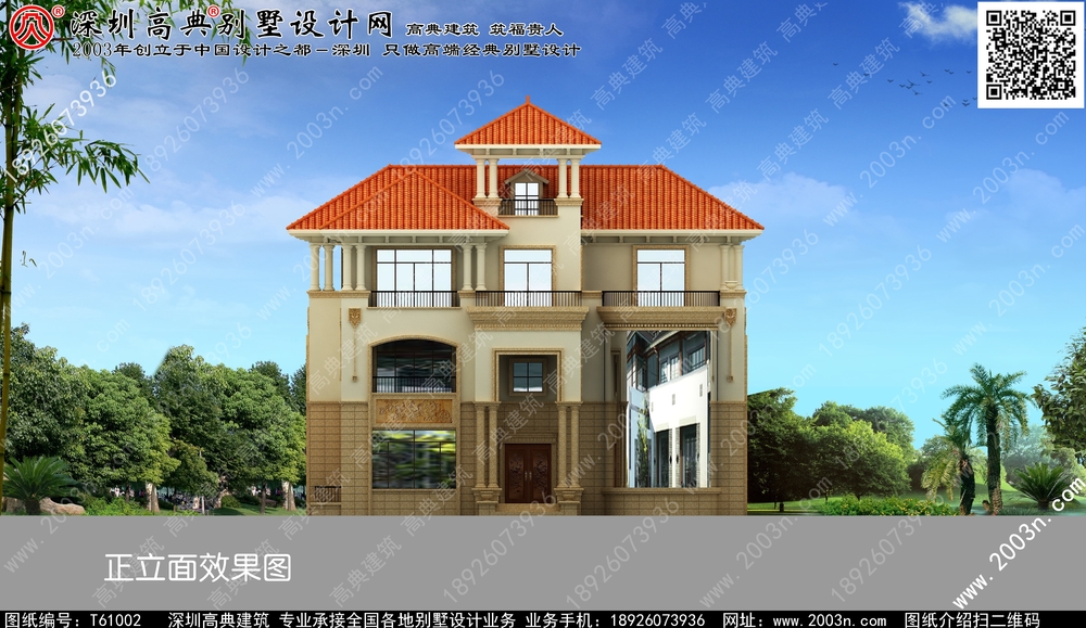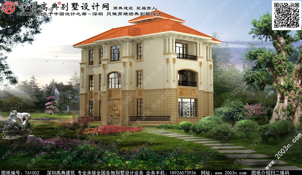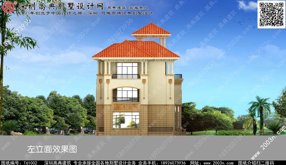 三层带车库别墅外观效果图首层154平方米图纸编号T61008
